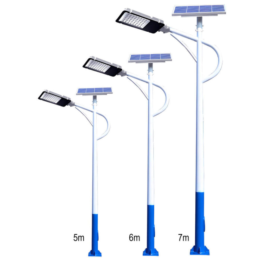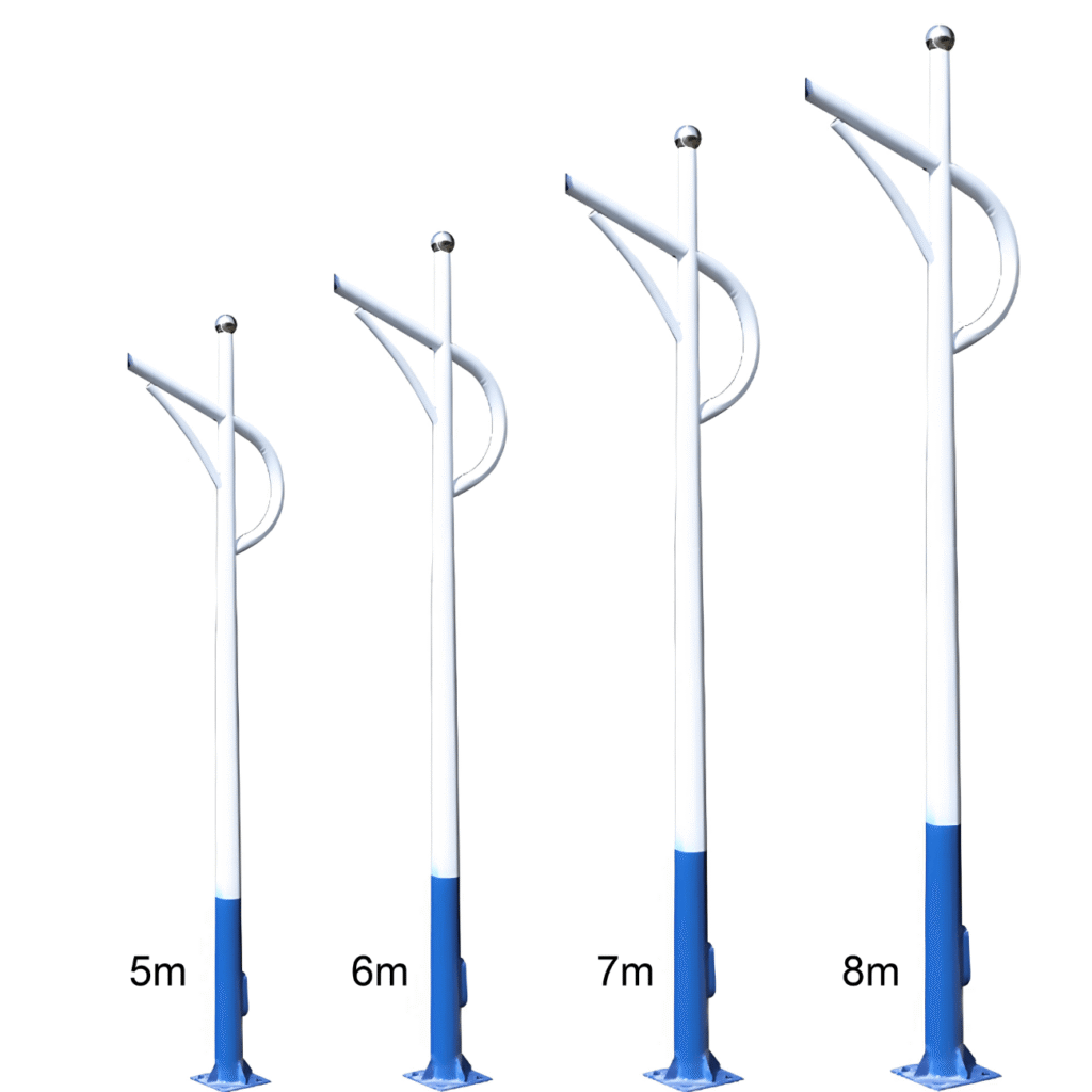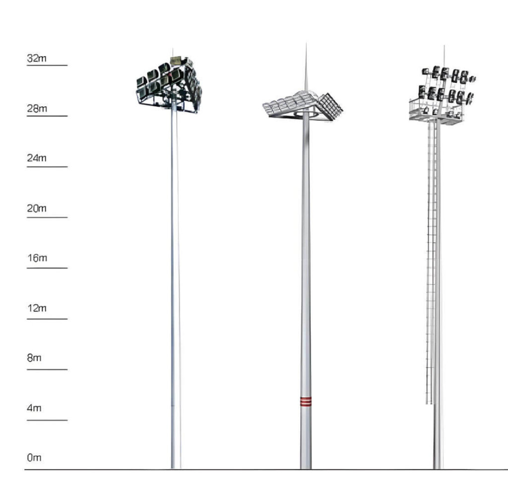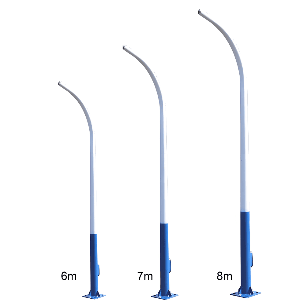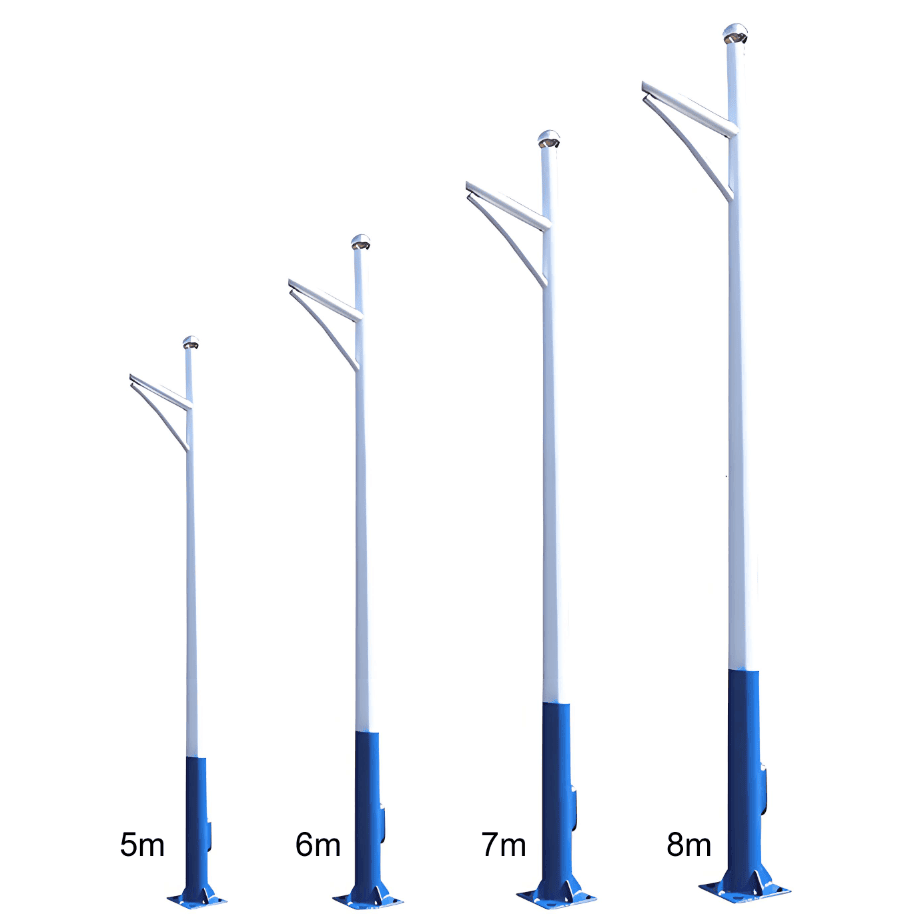 Main Categories of Light Poles, Steel light poles and galvanised lamp posts for urban and road lighting; Solar light poles for renewable energy street lighting systems; High mast poles and high mast light towers for ports, airports, and stadiums; Traffic light poles, traffic signal poles, and traffic lamp posts for intersections and highways