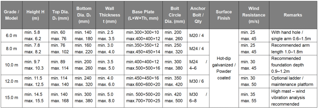 Use Q235 / Q345 (or equivalent grade) hot-rolled steel pipe. For high-mast poles, Q355 or higher strength steel is recommended. In coastal or highly corrosive areas, use thicker galvanization or stainless-steel fittings.